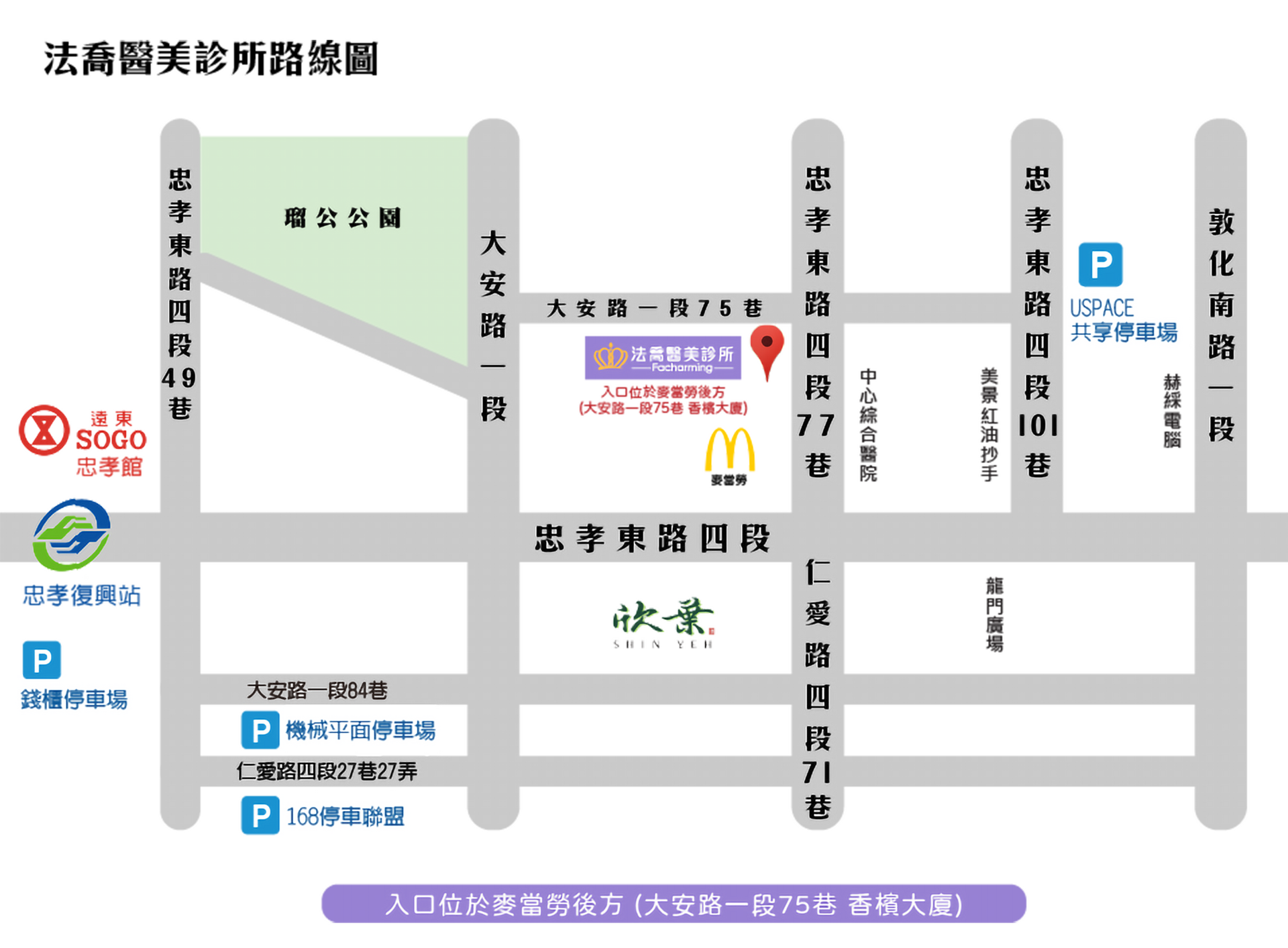 | Note: | Take Metro or Taxi from the hotel. It takes about 20~30 mins to the clinic nearby Ruei Feng Night Market and Hanshin Arena Shopping Plaza. |