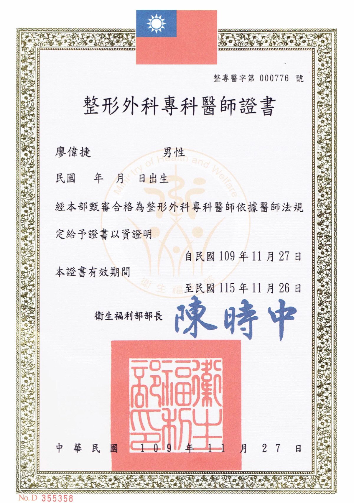 中華民國整形外科專科醫師(整專醫字第00776號)