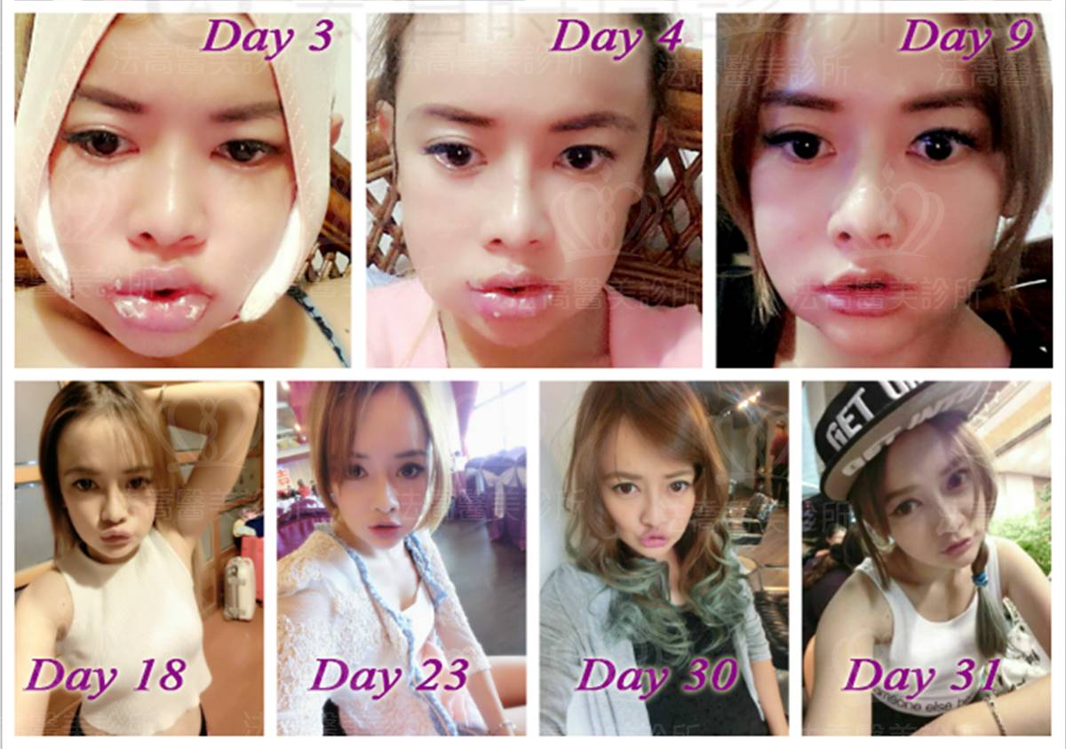 接下來就是漫長的復原期了,由於傷口在口腔裡所以第一週只能吃全流質食物,第二週吃半流質較軟食物,保持口腔衛生是非常的重要的,如果不按照醫師的叮嚀不注意是會容易引起傷口感染!術後的前四天我完全是不敢直視鏡中的自己,更驚呆的是因為帶著加壓的彈力頭套而沒有洗頭洗臉(後來才知道其實是可以洗,是我自己沒注意診所講的),熬過了最艱苦的4天後拆下了引流管,也結束了不能自己的流血水和口水的日子。