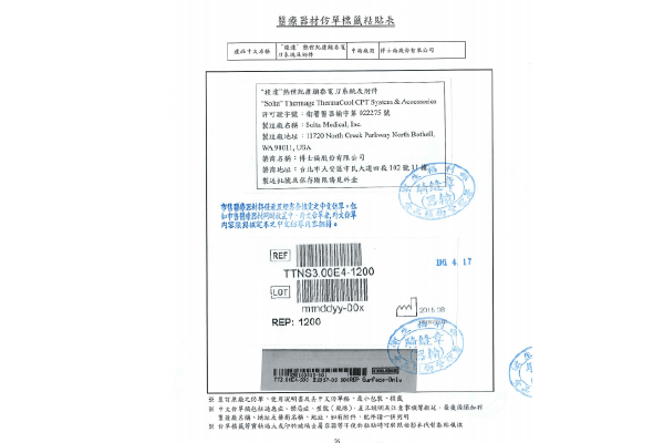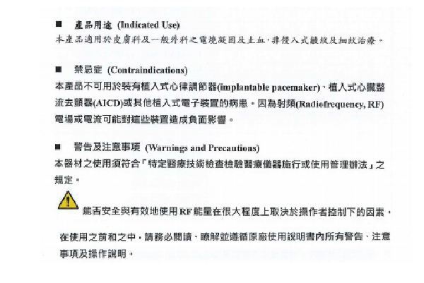 - 不可用於裝有植入式心律調節器(implantable pacemaker)、植入式心臟整流去顫器(AICD)或其他植入式電子裝置的病患。因為射頻(Radiofrequency,RF)電場或電流可能對這些裝置造成負面影響。