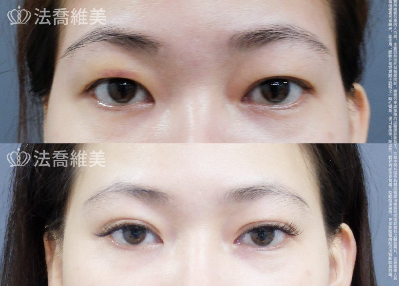 - 術後眼睛不自然 、 兩眼不對稱:術後可能因腫脹或疤痕問題,造成兩眼暫時性的不自然或不對稱,建議等 3至 6 個月,待疤痕軟化或完全消腫再做最後評估,通常雙眼不對稱需要進行二次修復的機率為 5%,人的器官多有天生性生理不對稱,加上大多是疤痕收縮造成。此為不可控制之因素,病患並無法要求雙眼 一定必須 100 %完全對稱 。