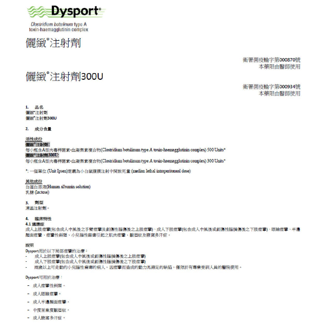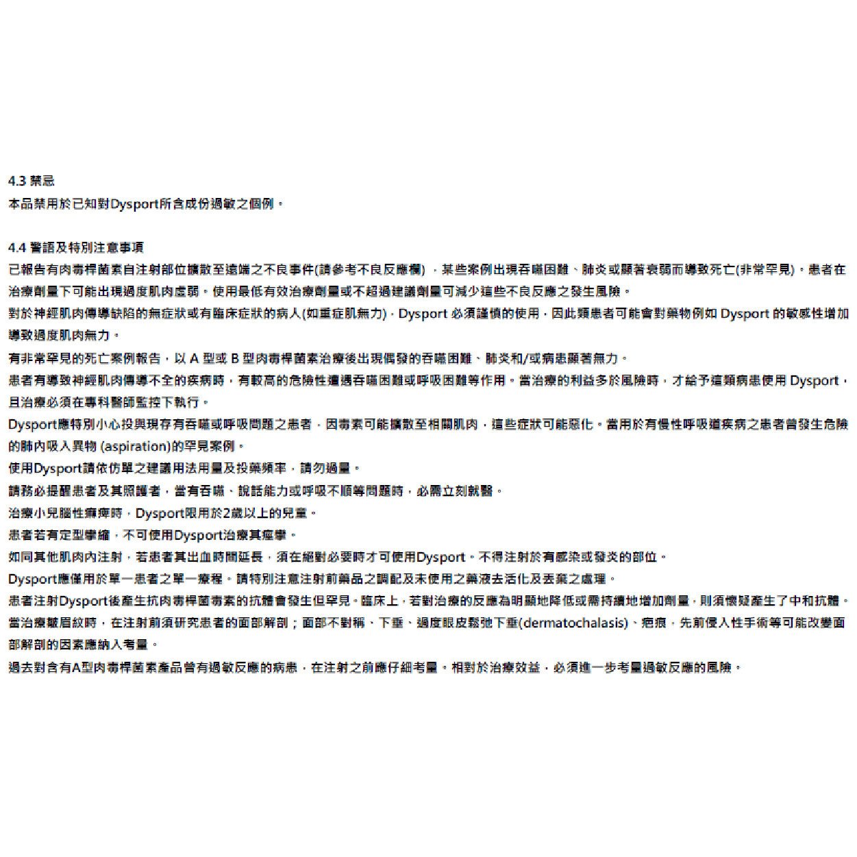 - 本品禁用於已知對Dysport所含成份過敏之個例。