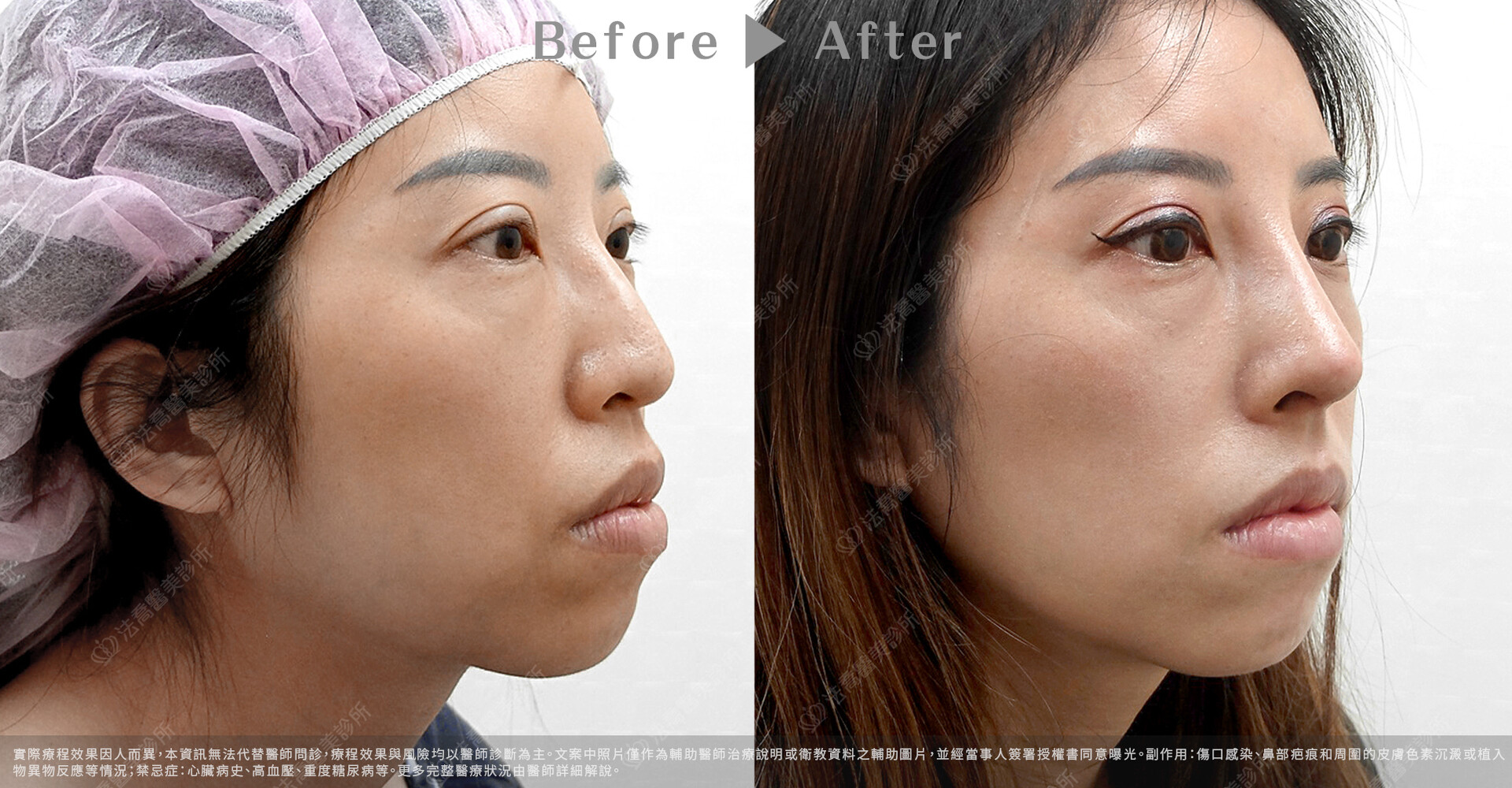 ▲自體肋骨隆鼻、鼻截骨、鼻部重建 / 術前與術後1個月(文案中照片僅作為輔助醫師治療說明或衛教資料之輔助圖片,並經當事人簽署授權書同意曝光。)