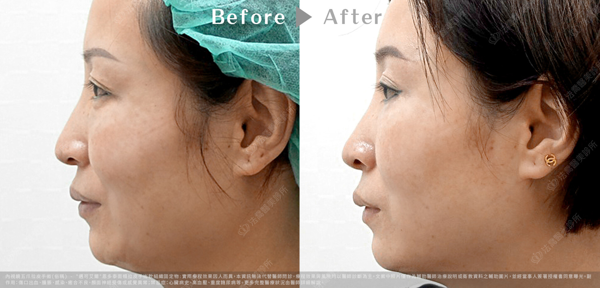 - 手術切口會在前額髮際線後,耳前和耳後,或是請病人於術前與醫師討論附加的手術項目,如上下眼皮手術,抽脂肪及脂肪注射等。