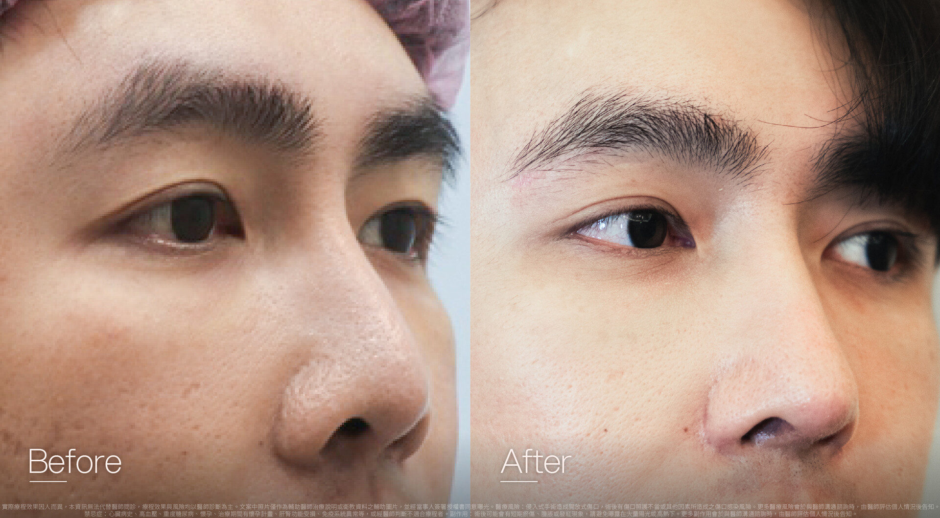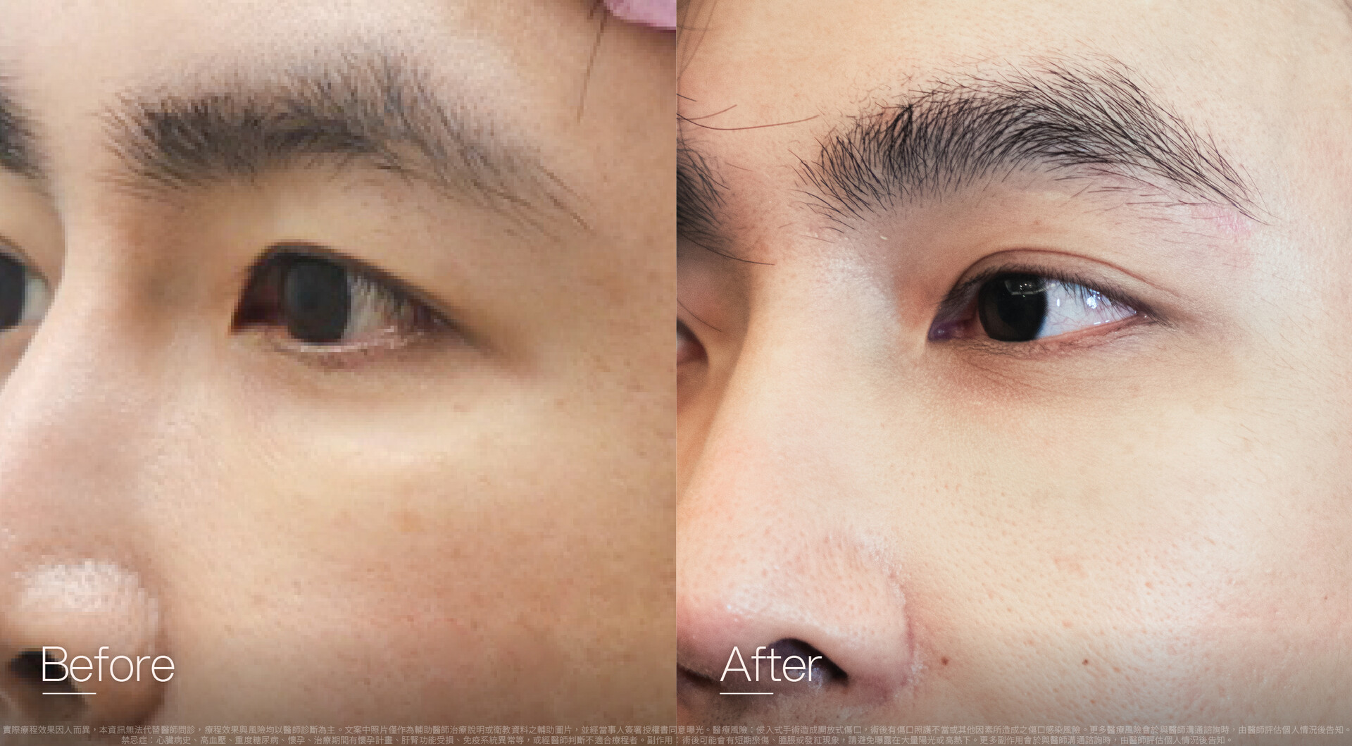 - 眼瞼整形手術者,術後可能因疤痕反應造成眼瞼外翻或雙眼不對稱之一時性現象,此多半會在術後半年左右,疤痕穩定後逐漸改善。