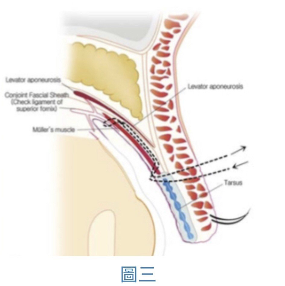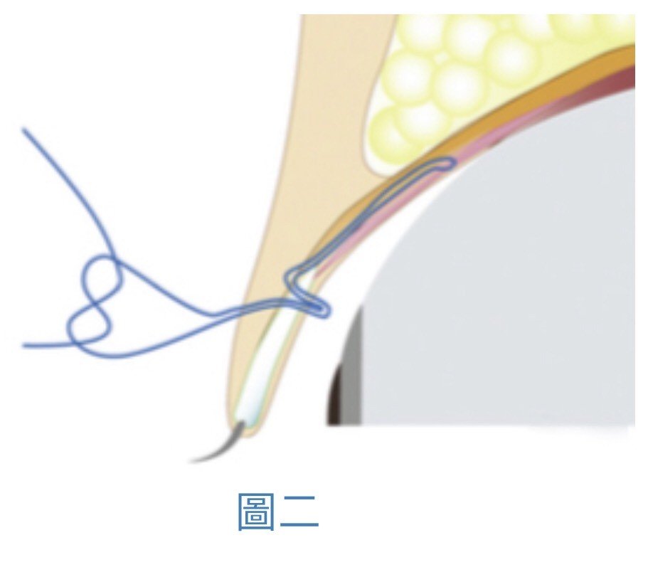 在吳醫師個⼈施⾏雙眼⽪⼿術經驗中,⼤約有3成客⼈是單眼⽪,3成是⼤⼩眼或是眼⽪不對稱,2成是內雙,另外2成是曾經做過眼部整形⼿術想重新修整的。其中⼤⼩眼及重新修整⼿術是比較困難⽽複雜的⼿術,多數醫師採⽤切式雙眼⽪的術式矯正,但是術後腫脹疼痛導致恢復期可能長達3-4個⽉之久,對於⼀般⼤眾來說會比較懼怕。為此,吳醫師個⼈採⽤新式微創雙眼⽪手術縫法(2010⽇本及2017韓國學者整外雜誌發表)如圖(⼆)及(三)。最顯著的差異就是腫脹期縮短⾄約⼀週,無疤痕,當然恢復快,約2-3天就可以回到職埸,所以深獲⼀般⼤眾的好評。