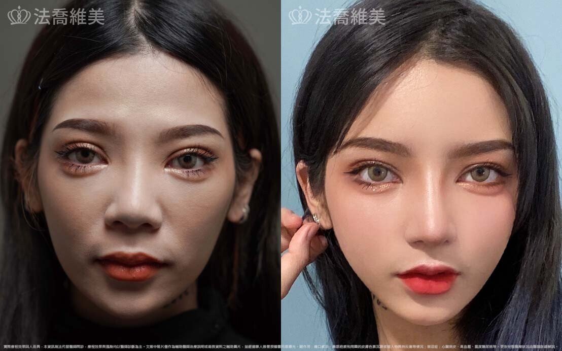 我們可以看到YAZ原本山根塌陷,鼻頭也屬於有肉的、鼻翼寬的鼻型,側面角度不柔和、較陽剛,邱醫師評估後建議她做的手術項目是自體肋骨隆鼻合併縮鼻翼,為她量身打造混血顏。手術後YAZ不只鼻子變挺了,還因為山根的改變,使臉部輪廓都被突顯出來,五官變得更加立體,連臉的比例都變小了呢,加上還搭配了縮鼻翼,鼻型更加小巧精緻。