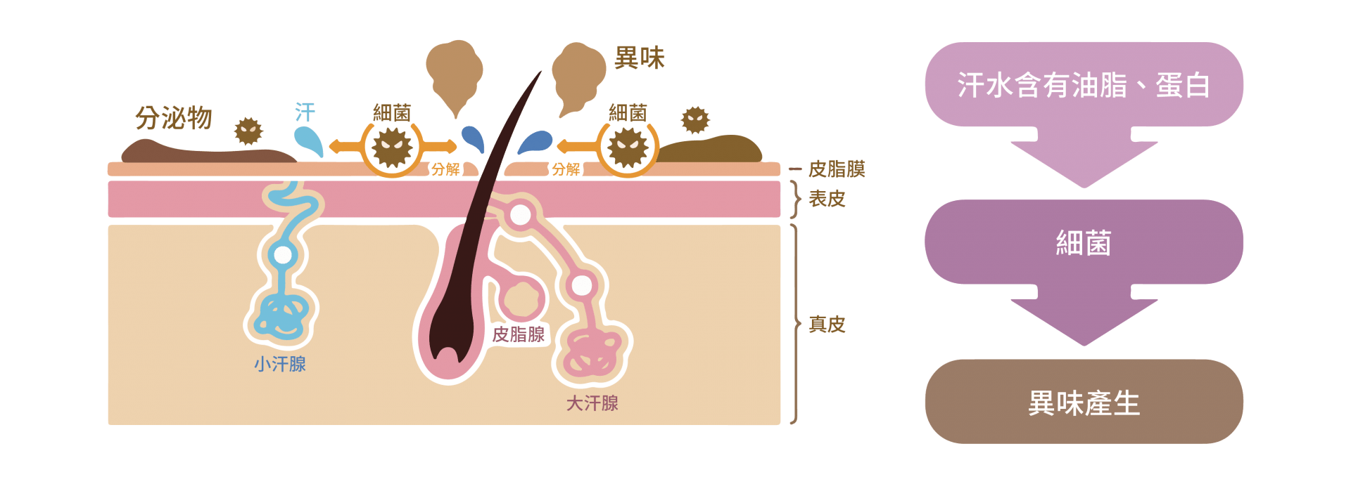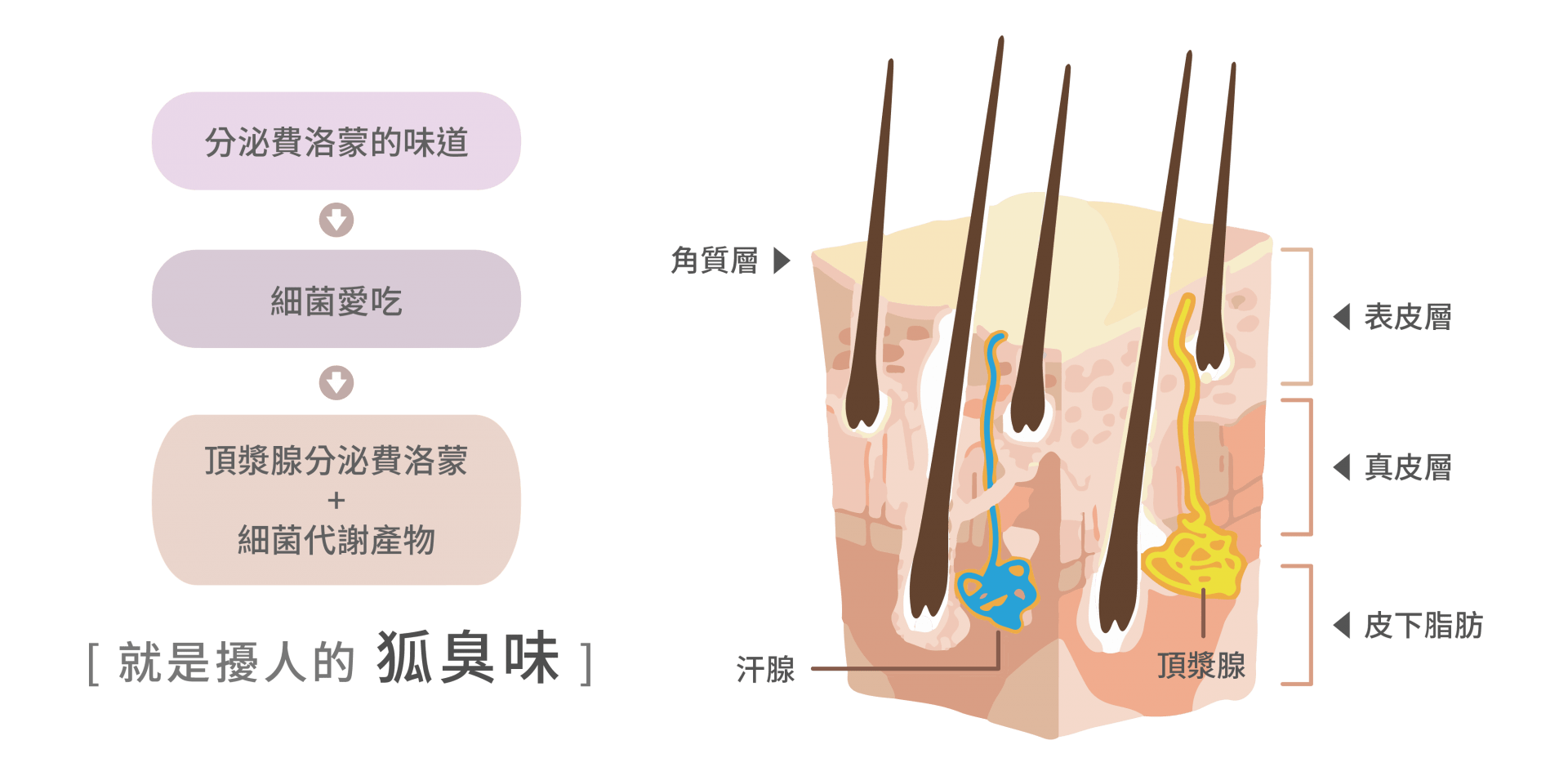 當你流汗的時候,常常不自覺自己身上有些異味,通常都是經過旁人的提醒,才發現原來自己會有一些「特殊」的體味。腋下的臭味就是其中一種。這也就是俗稱的「狐臭」!許多人可能會以為狐臭的產生就是因為自己汗腺太發達,但其實是因為汗腺分泌物與細菌結合,才會產生令人頭痛的臭味。