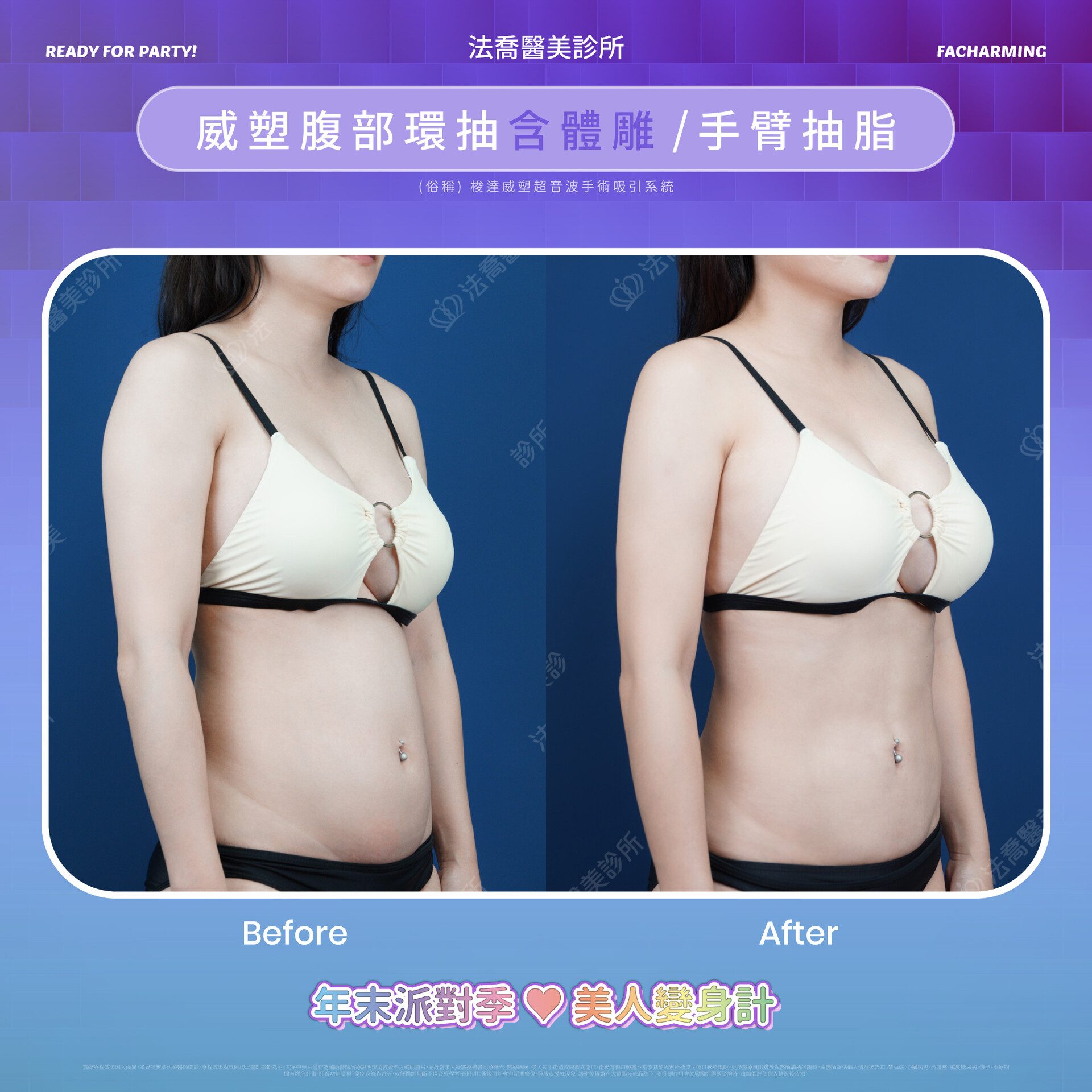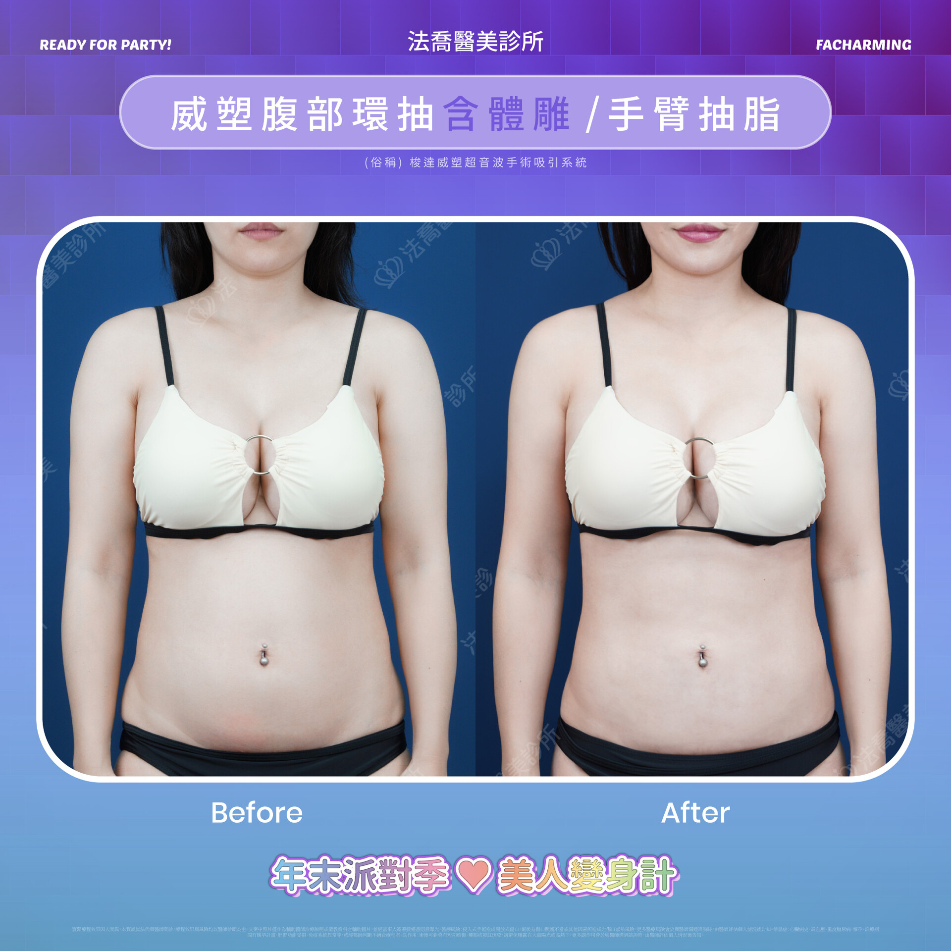 二代威塑(俗稱) - 梭達威塑超音波手術吸引系統。實際療程效果因人而異,本資訊無法代替醫師問診,療程效果與風險均以醫師診斷為主。文案中照片僅作為輔助醫師治療說明或衛教資料之輔助圖片,並經當事人簽署授權書同意曝光。副作用:皮膚腫脹疼痛瘀血、抽脂部位皮膚感覺異常及麻木、抽脂部位皮膚凹凸不平等情況;禁忌症:糖尿病、高血壓、心臟病等。更多完整醫療狀況由醫師詳細解說。