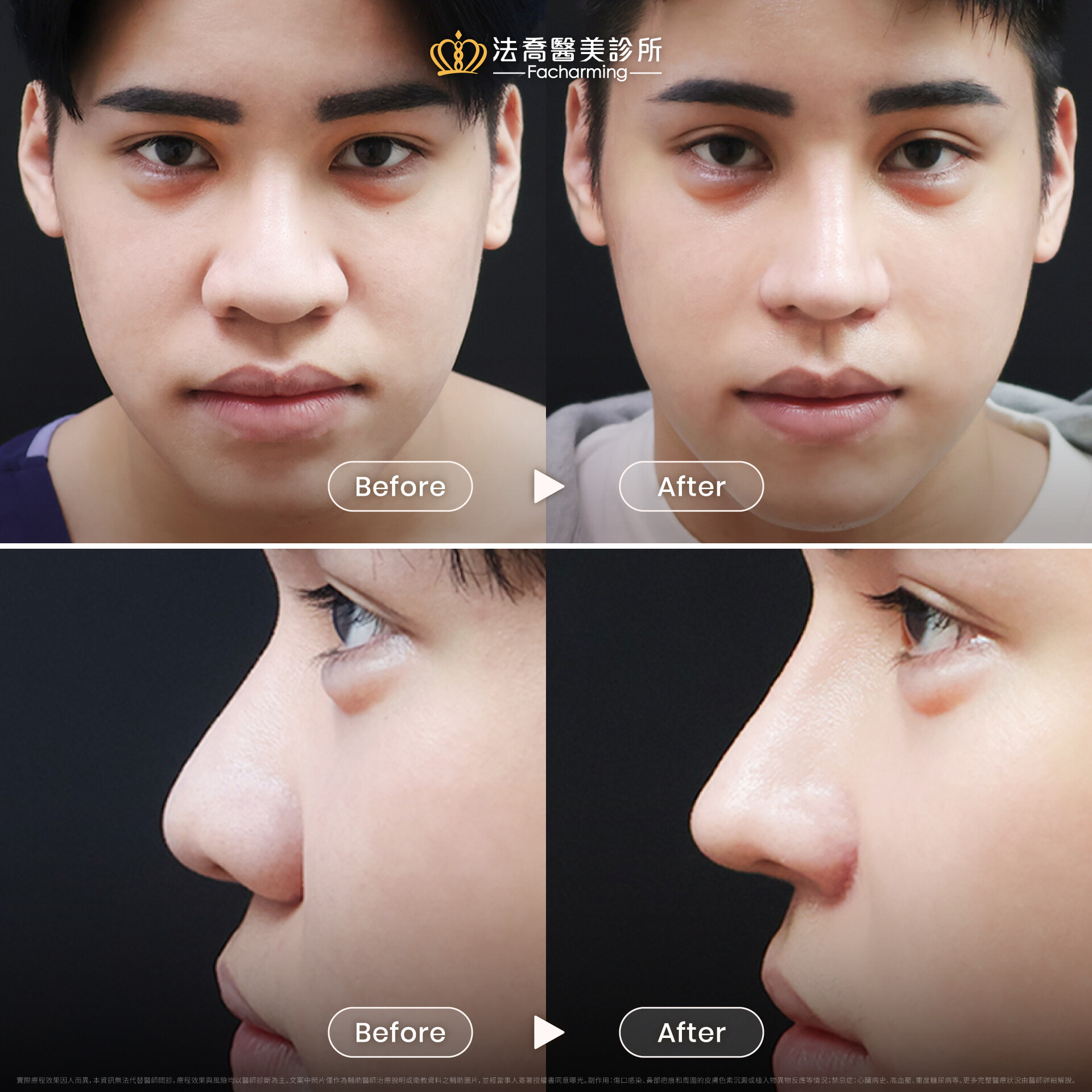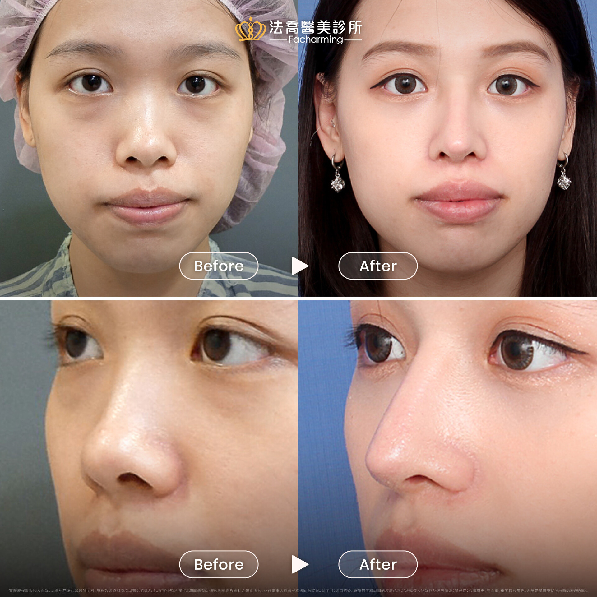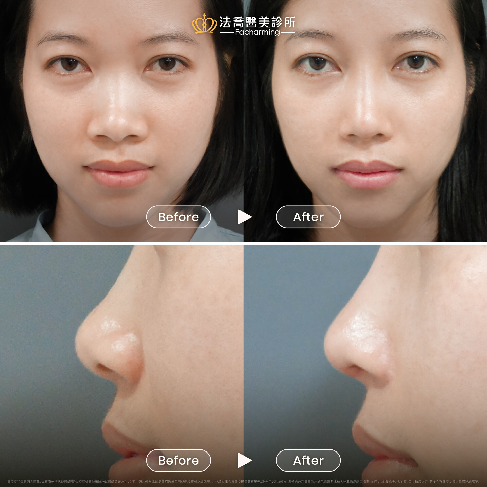實際療程效果因人而異,本資訊無法代替醫師問診,療程效果與風險均以醫師診斷為主。文案中照片僅作為輔助醫師治療說明或衛教資料之輔助圖片,並經當事人簽署授權書同意曝光。副作用:傷口感染、鼻部疤痕和周圍的皮膚色素沉澱或植入物異物反應等情況;禁忌症:心臟病史、高血壓、重度糖尿病等。更多完整醫療狀況由醫師詳細解說。