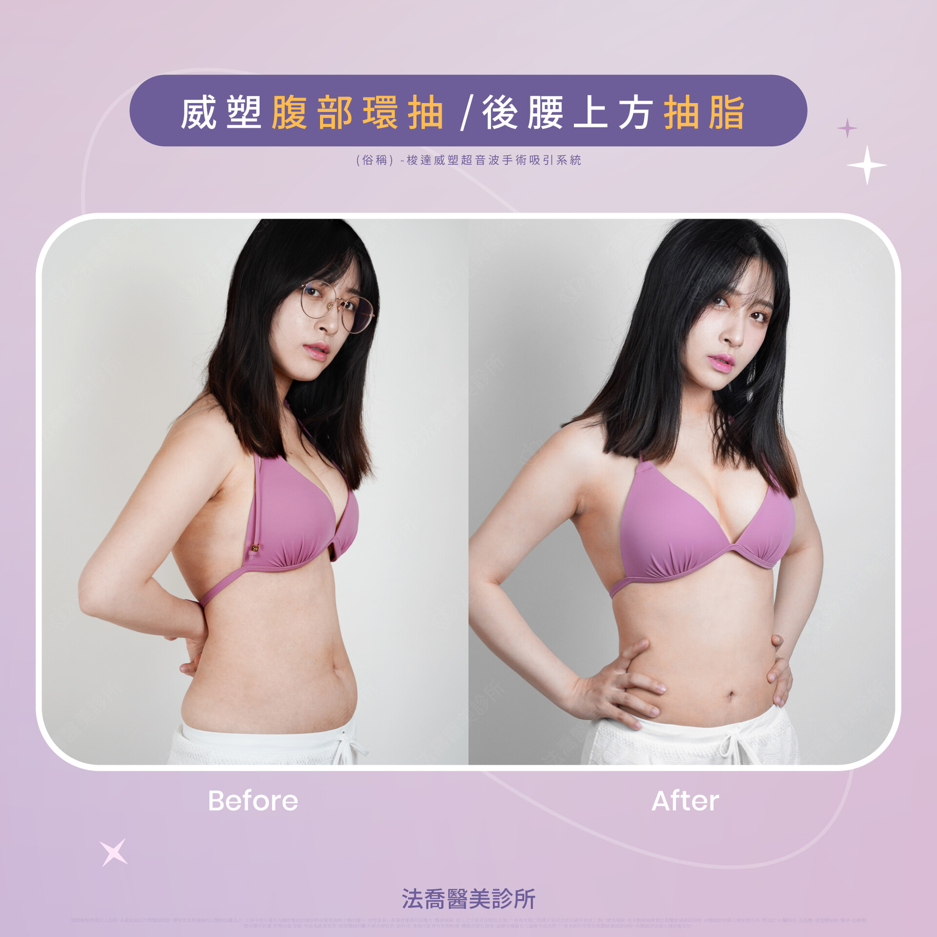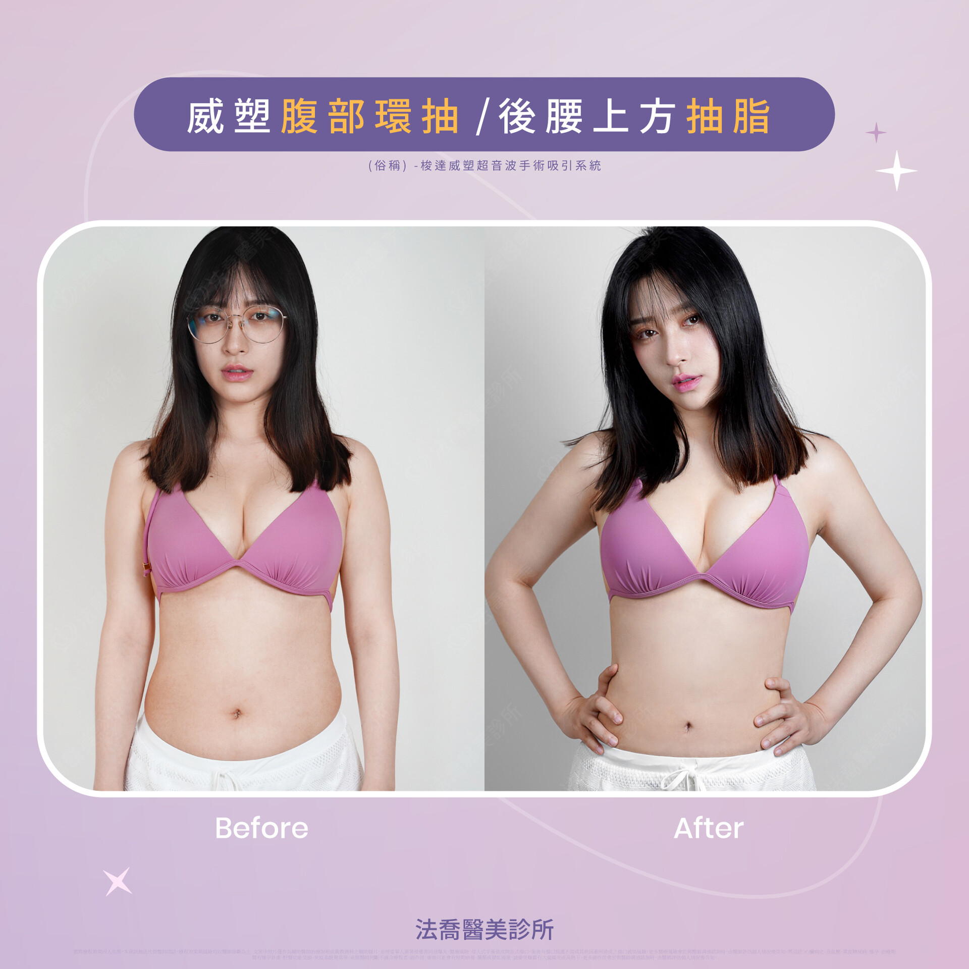 二代威塑(俗稱) - 梭達威塑超音波手術吸引系統。實際療程效果因人而異,本資訊無法代替醫師問診,療程效果與風險均以醫師診斷為主。文案中照片僅作為輔助醫師治療說明或衛教資料之輔助圖片,並經當事人簽署授權書同意曝光。副作用:皮膚腫脹疼痛瘀血、抽脂部位皮膚感覺異常及麻木、抽脂部位皮膚凹凸不平等情況;禁忌症:糖尿病、高血壓、心臟病等。更多完整醫療狀況由醫師詳細解說。