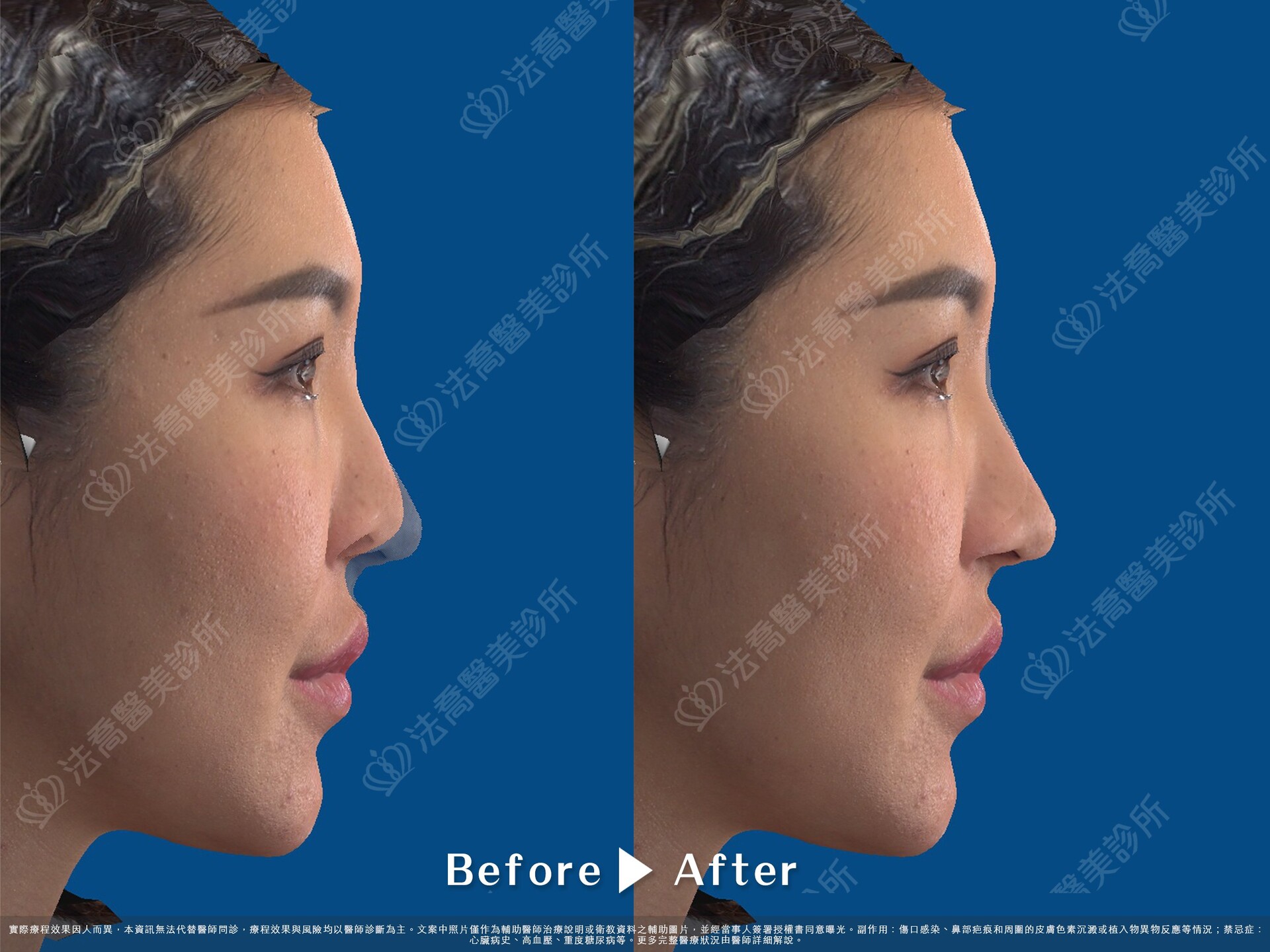 實際療程效果因人而異,本資訊無法代替醫師問診,療程效果與風險均以醫師診斷為主。文案中照片僅作為輔助醫師治療說明或衛教資料之輔助圖片,並經當事人簽署授權書同意曝光。副作用:傷口感染、鼻部疤痕和周圍的皮膚色素沉澱或植入物異物反應等情況;禁忌症:心臟病史、高血壓、重度糖尿病等。更多完整醫療狀況由醫師詳細解說。