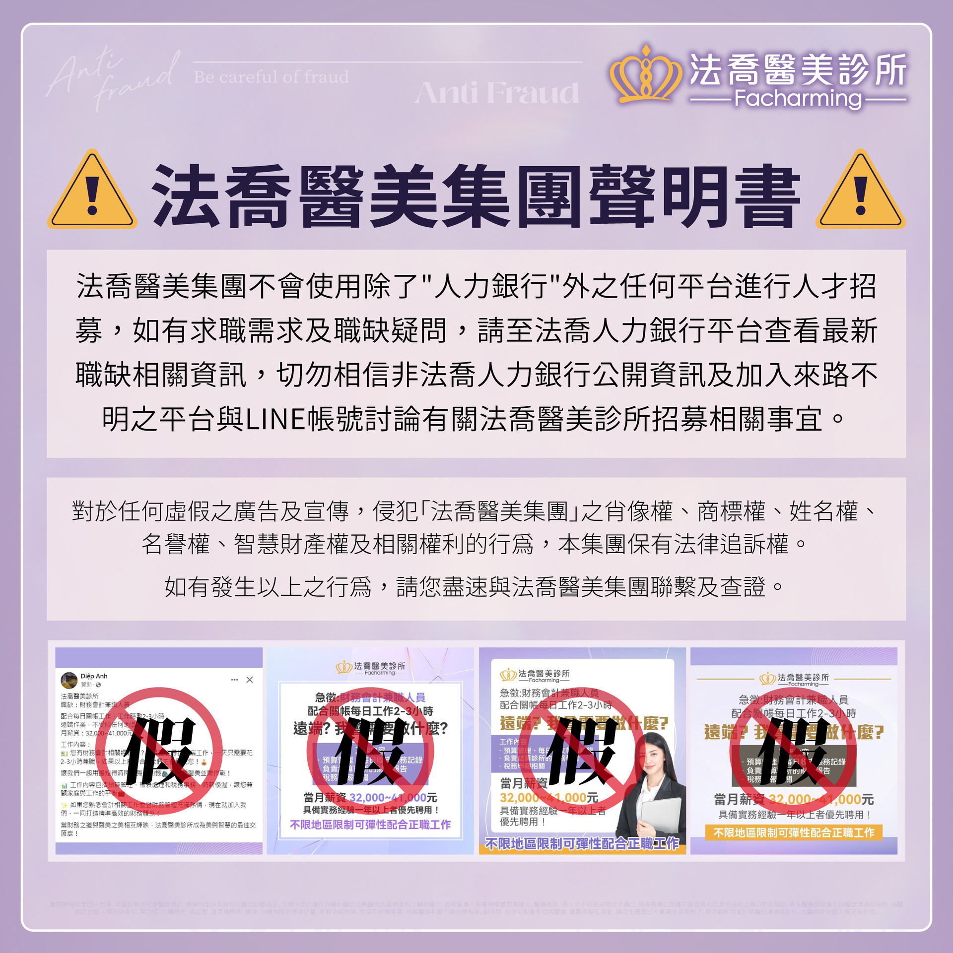 法喬醫美集團反詐騙聲明書⚠️法喬醫美集團反詐騙聲明書⚠️ 針對近期疑似不肖人士或是詐騙集團使用「法喬醫美診所」進行求職、兼職招募詐騙,法喬醫美集團在此特別澄清。法喬醫美集團不會使用除了人力銀行或是官網進行人才招募,關於法喬醫美集團「不明求職/求才資訊」、「提示履歷」、 …on- Wed, 17 Jul 2024- READ MORE - -