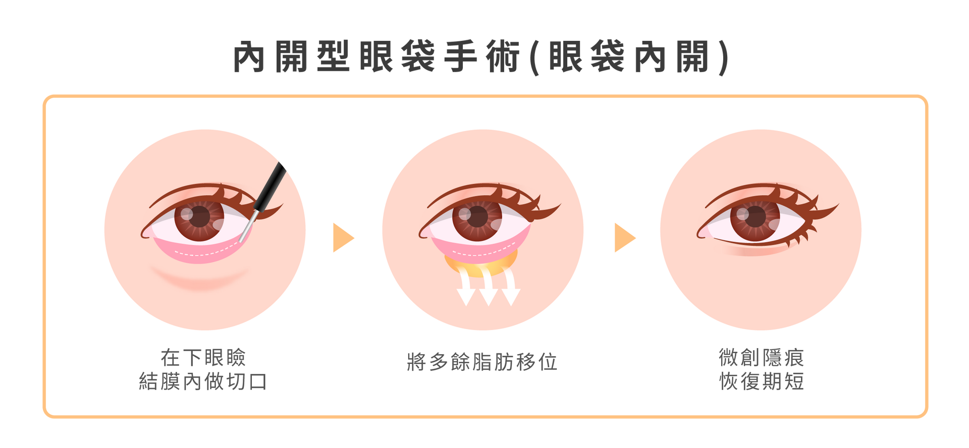 - 手術切口經眼下結膜切開後,將多餘的脂肪移除或是移位至淚溝處,移位的脂肪會在眼下表皮處有2處縫線固定,3天即可拆線,並無其他外觀傷口。