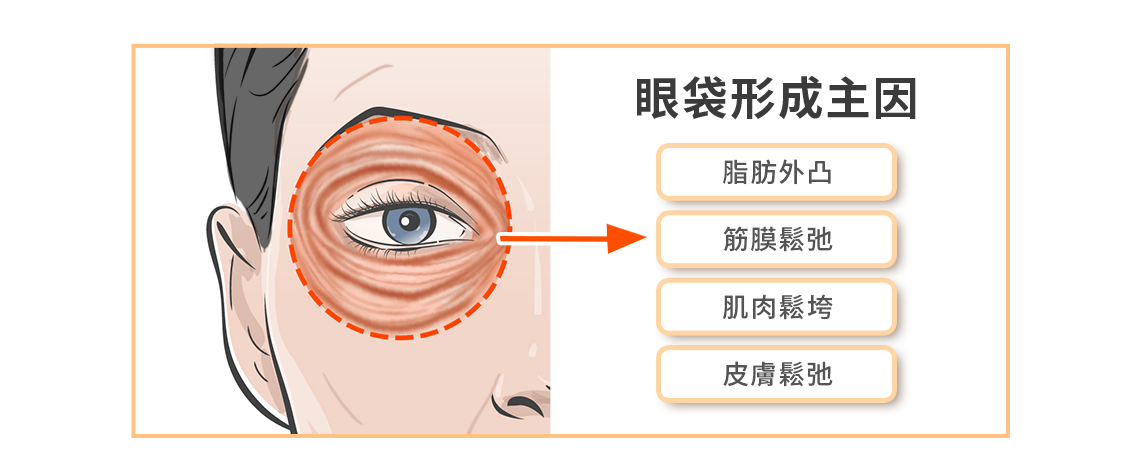 眼袋形成的原因是因下眼瞼生理性的衰老,導致眼瞼皮膚、眼輪匝肌和眼眶隔等組織鬆弛形成的下眼瞼皮膚皺紋和腫泡樣的變化。年齡較大者或輕或重都會有眼袋,大眼袋讓人看起來疲憊、沒有活力,就使人顯現出老態,影響容貌。不只是熟齡人會有眼袋問題,越來越多年輕人也開始出現眼皮鬆弛、下垂現象。當臉上出現眼袋,只會越來越大不容易消失,隨著凸出時間越長眼皮也會越鬆,想解決老態面容就只能透過眼袋手術來解決了。