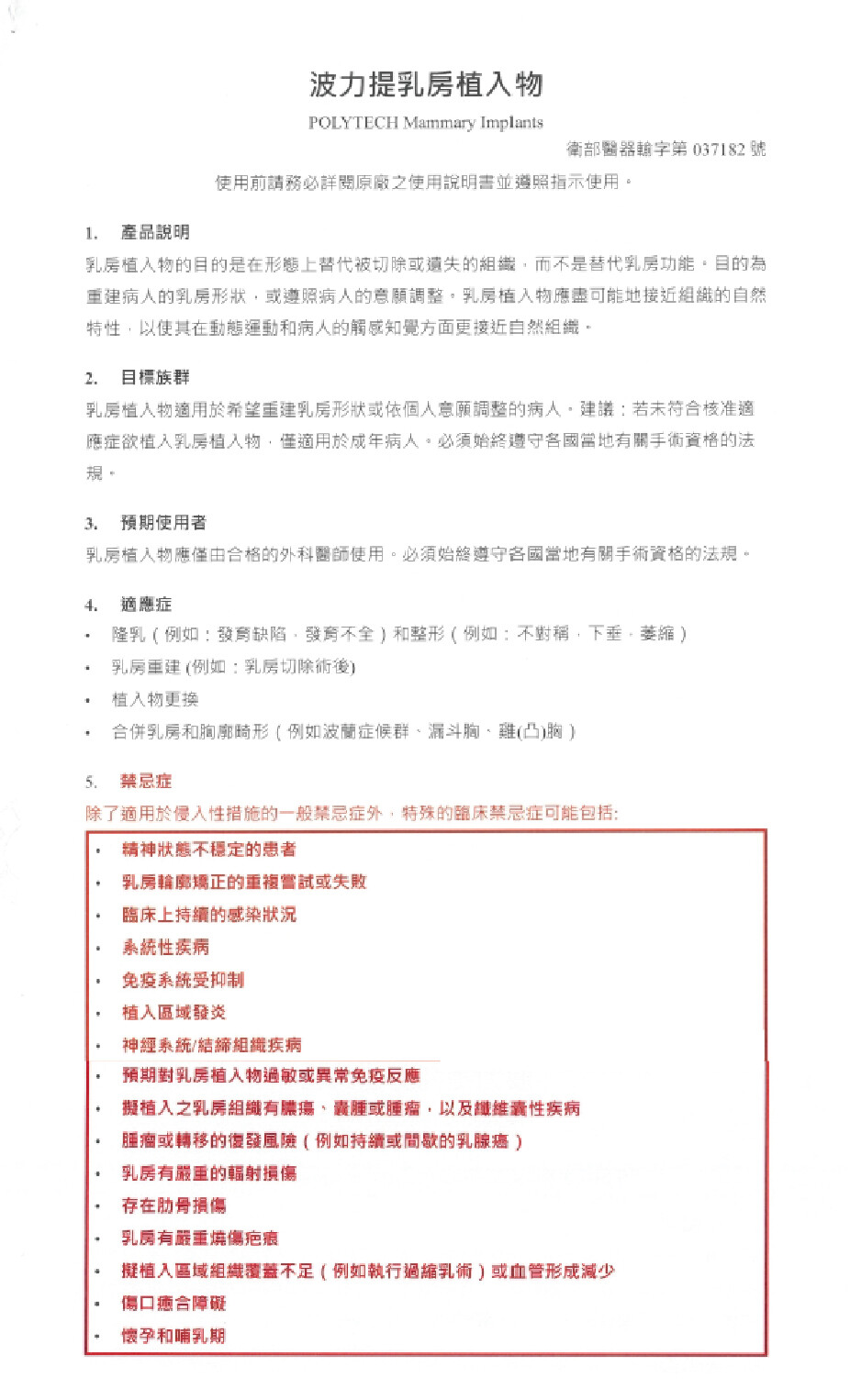 - 乳房植入物相關間變性大細胞淋巴癌(BIA-ALCL):幾項調查研究顬示,乳房植入物與ALCL的發生可能存在關聯。這意味著植入乳房植入物的女性可能存在微小增加的ALCL風險。病人應由負責手術的外科醫師告知存在低風險的ALCL ·並建議在手術後一年以上出現血清腫或植入區域腫脹和疼痛等症狀時諮詢主治醫師。